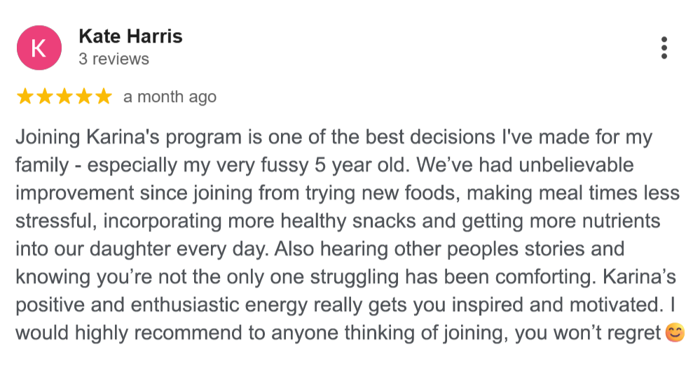 “Karina has truly transformed the way our son eats. Her support and guidance inside the membership has been life changing and has given me so much confidence. He now eats a great variety of foods - even better than us!